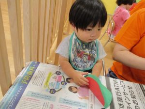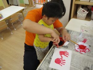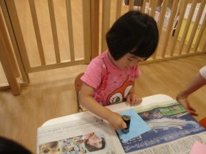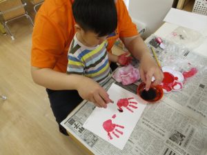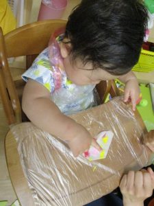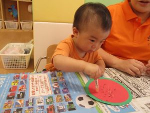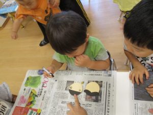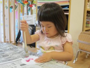クレパス、シール貼り、絵の具(たんぽ)などをしました。