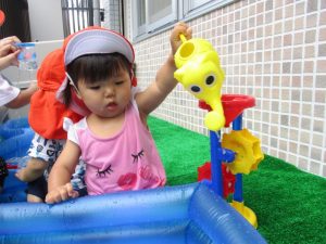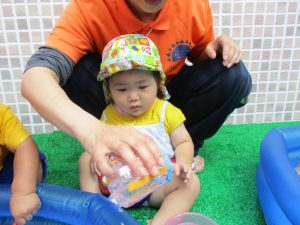お水を怖がることもなく、水あそびに夢中です。![]()