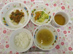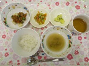 2018.08.01|給食ピックアップ 本日のお給食 8月1日(水)のこんだて *もも組さん(完了食)、いちご組さん、りんご組さん ・ごはん ・みそ汁 ・高野豆腐の煮物 ・おかか和え(いんげんをキャベツとアスパラに変更) ・粉ふき芋 前へ 次へ