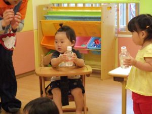 水の入ったペットボトルを、魔法の呪文『しゃかしゃか ふりふり ほほほいほい!」を