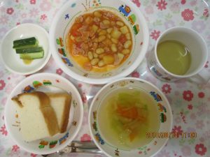 8月10日(金)のこんだて *いちごぐみさん・りんごぐみさん* ・食パン ・ポークビーンズ ・野菜ス...