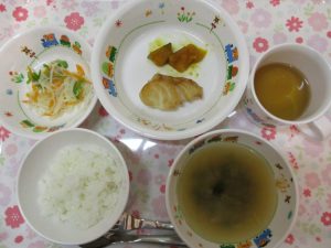 9月6日(木)のこんだて *いちごぐみさん・りんごぐみさん* ・ごはん ・たまねぎのみそ汁 ・粉ふき...