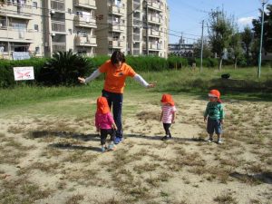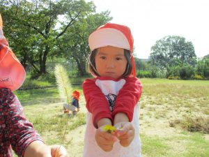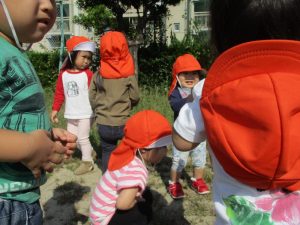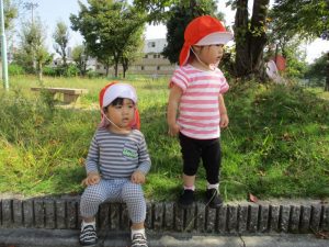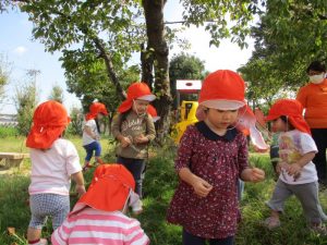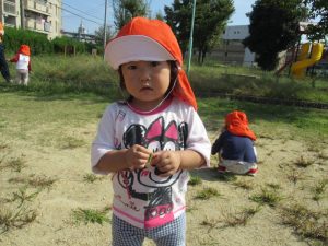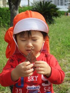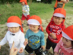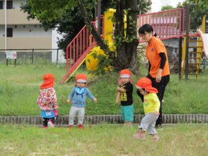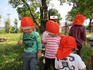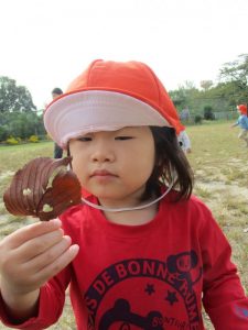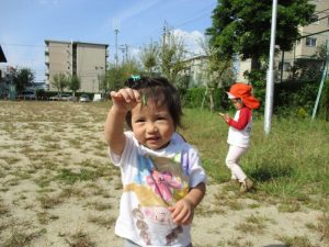 公園へ遊びに行くと、トンボを見つけたり、バッタにも慣れてきたようで、以前触れなかったお子さんが、触ってみようと挑んだり、落ち葉も触ったりと秋の自然に触れていますよ![]()