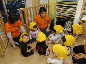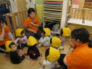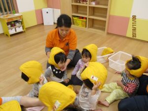 「地震です‼」園長先生の声で、子どもたちが保育室の中央に集まりました(>_<)