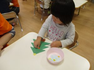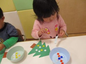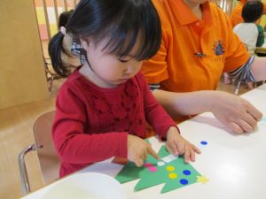 クリスマスツリーに〇シールをペタっと貼っていきます![]()