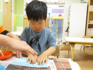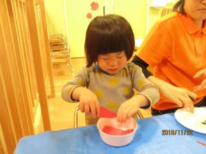 赤い画用紙を指先を使って、ビリビリと細かくちぎっています![]()