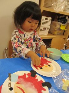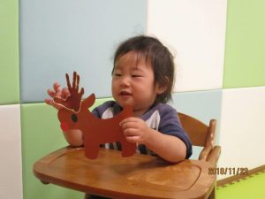 ももぐみさんは、トナカイの体に目と鼻、手形で作ったツノを貼っていますよ![]()