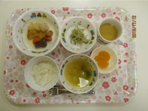 11月14日(水)のこんだて *いちごぐみさん・りんごぐみさん* ・ごはん ・みそ汁 ・筑前煮 ・サ...