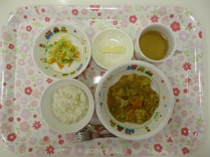 12月20日(木)のこんだて ・ごはん ・カレーシチュー ・キャベツのドレッシングサラダ ・チーズ