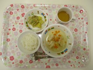 12月18日(火)のこんだて ・ごはん ・みそ汁 ・さばの竜田揚げ ・野菜炒め ・含め煮