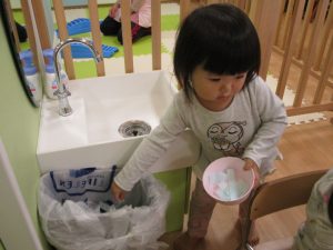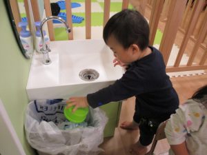 シール貼りの製作で、シールを貼りおわったゴミを自分たちで捨てに行きました![]()