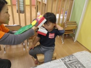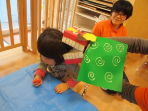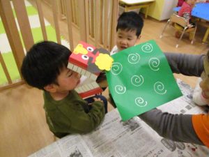 製作や粘土遊びをしているときになんと・・・獅子舞がやってきました![]()