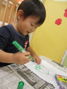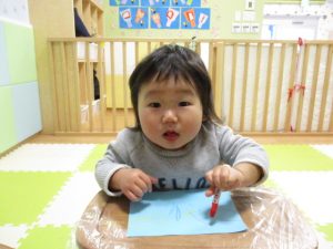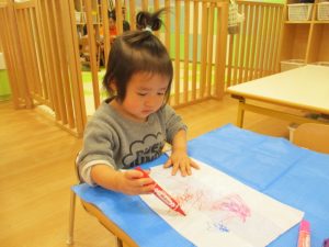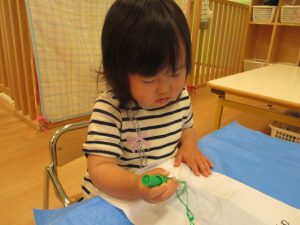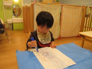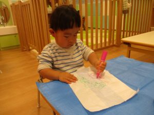 顔を描いたり、色を分けて順番に線を虹のように描いたり、上から混ぜて色が混ざるのを楽しむ姿も見られましたよ![]()