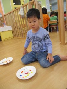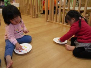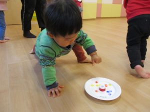 いちごぐみさん?が、紙皿のコマにシールを付けています![]()