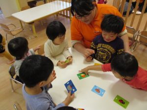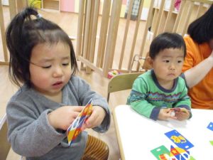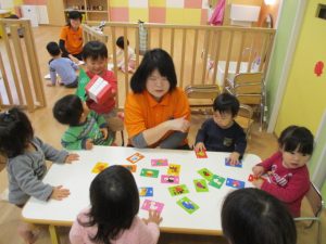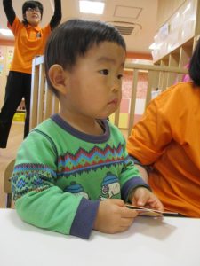 保育者のかるたの言葉をよく聞いて・・・?![]()