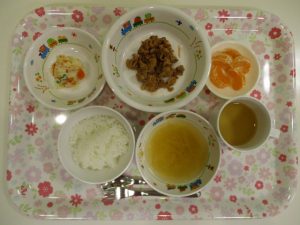 1月4日(金)のこんだて ・ごはん ・カレーシチュー ・マカロニサラダ ・みかん缶