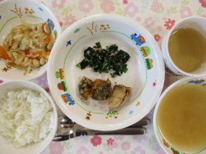 2月22日(金)のこんだて ・ごはん ・みそ汁 ・さばの竜田揚げ ・切り干し大根の煮物 ・ほうれん草...