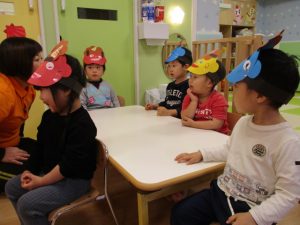 朝のおやつが終わると、保育者から節分のお話があり、お歌を歌いました![]()