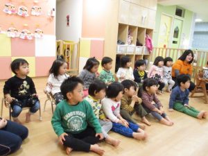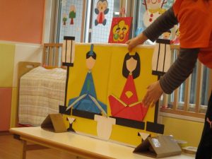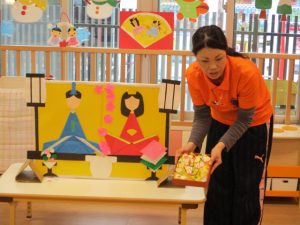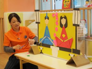 それぞれの作品の紹介が終わって、保育者からの出し物『おひなさまを作ろう』を見ました![]()