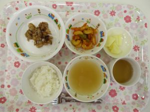 4月4日(木)のこんだて *ももぐみさん(中期) ・おかゆ(10倍がゆ) ・すりつぶしポトフ ・きざ...