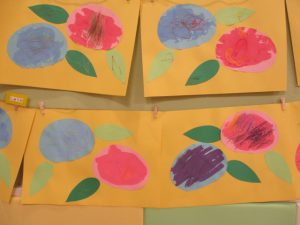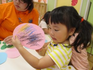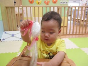 製作ではお花紙を丸めてビニール袋に入れ、目や口、模様のシールを貼りました![]()