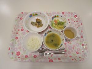 6月4日(火) のお給食 ・ご飯 ・豚肉の甘酢炒め ・おかか和え ・みそ汁 (たまねぎ...