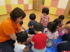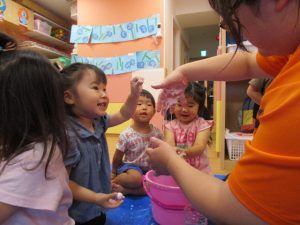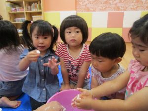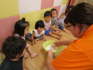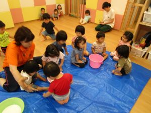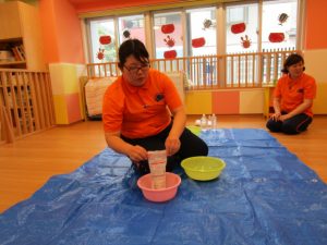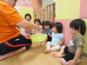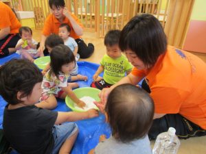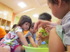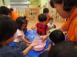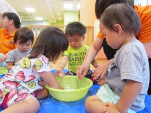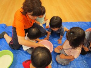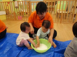 慣れてきて、両手を入れてだんだん大胆になるお友だちや、戸惑いながらも自分から触ってみるお友だち![]()