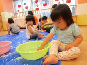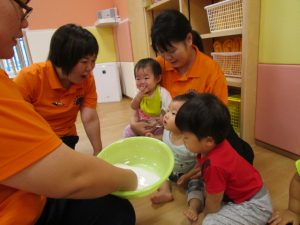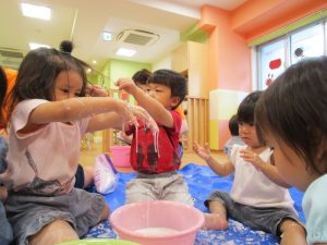 粉の時とは違う水を入れた片栗粉の感触や、流れ落ちる様子に喜んだり