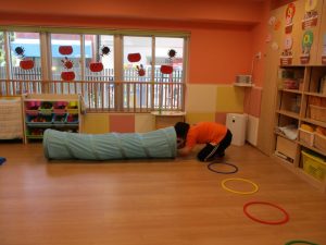 トンネル、ウエーブ平均台、フープに取り組みます![]()