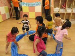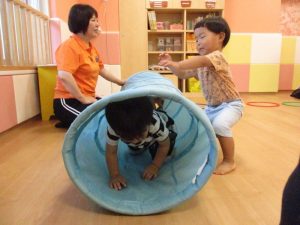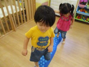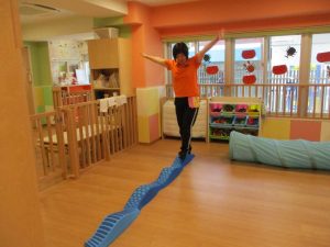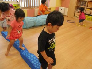 「トンネルをくぐったら、平均台はバランスを取って、落ちないように渡ってね。」