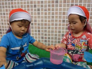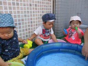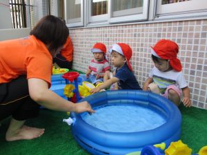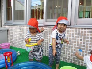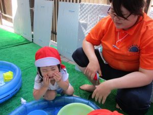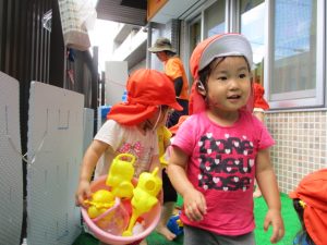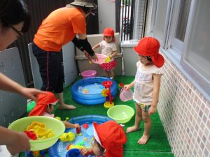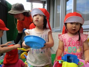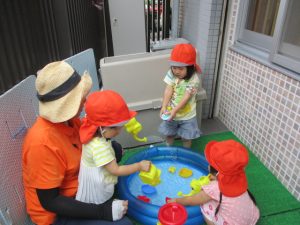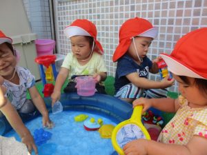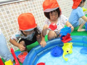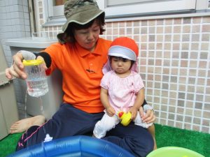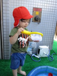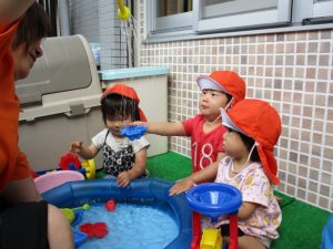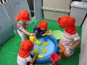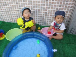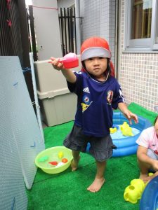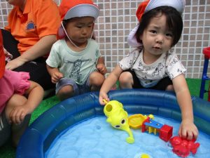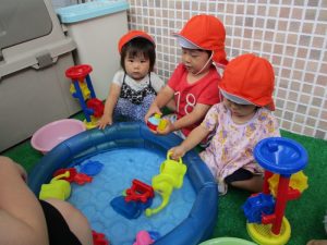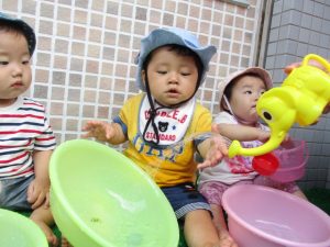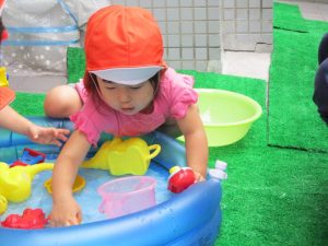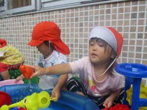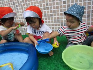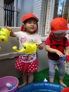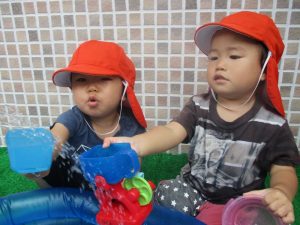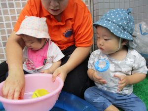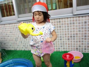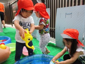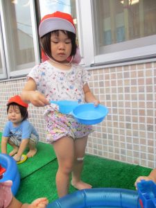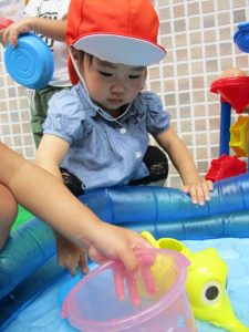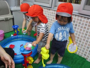 色々なおもちゃで、お水をくんだり流したりして、楽しく遊びました![]()