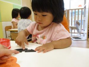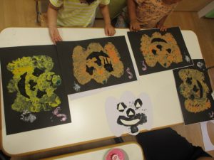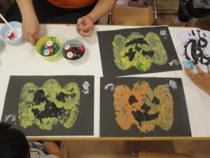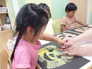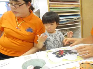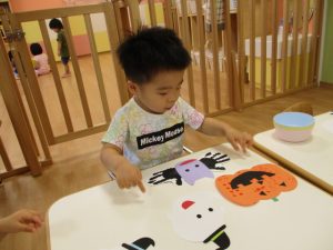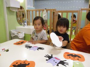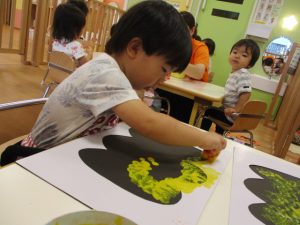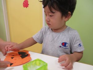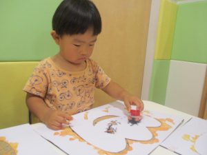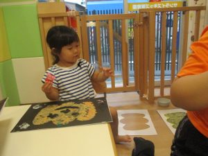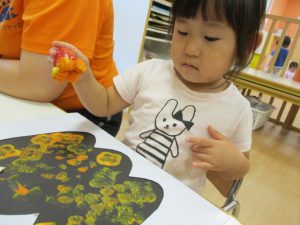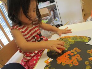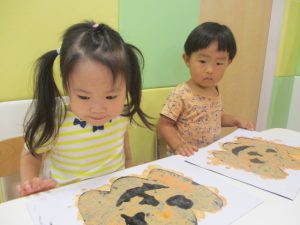 かぼちゃ型の枠に沿って、タンポを押しているお子さんもいれば、空いているところをのびのびとトントンとしているお子さんもいて・・・皆顔つきは、真剣です![]()