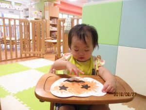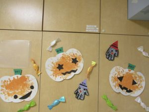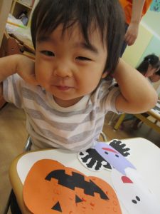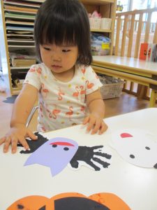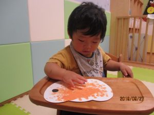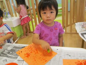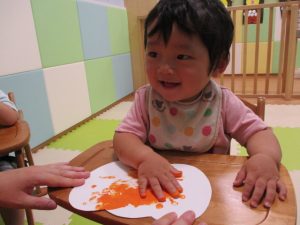 かぼちゃ型の画用紙にオレンジの絵の具を手に付けて、ペタペタ・・・