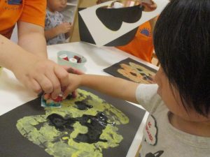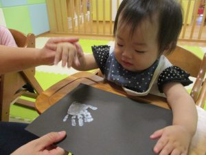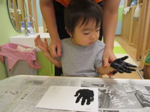 黒い絵の具を手に付けたので、少し怖がるお子さんもいましたが、絵の具の感触を楽しむお子さんもいました![]()