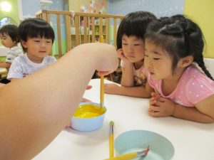 2色の絵の具が混ざっていく様子をじっと見ていく子どもたち![]()