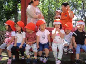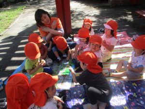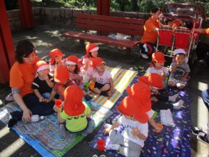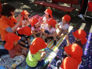 公園へ着き、シートに座って、手をきれいにして、おやつの歌をうたいますよ![]()