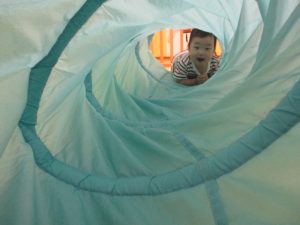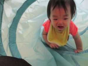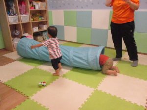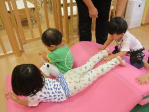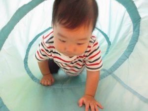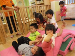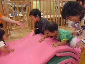マットの小山をハイハイで渡ったり、ワニさんのように腹ばいで渡ったり、回を重ねるごとに大胆になり、転がったり、楽しんでいました![]()