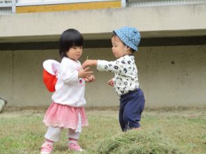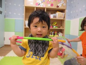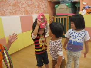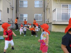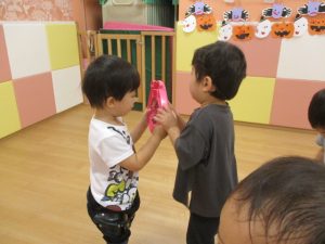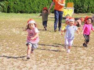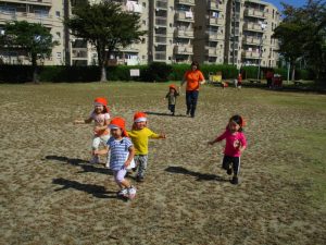 ご兄弟のいらっしゃるお子さんは、運動会を見たことがあるかな?ということで、少し意識をして、運動会あそびをしました![]()