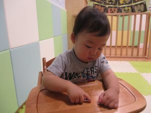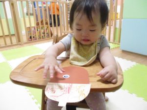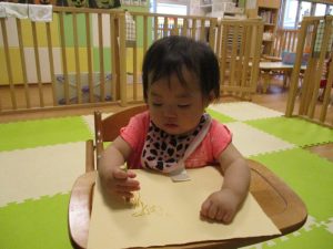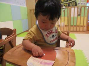 保育園では、初めての取り組みでしたが、反応はさまざまで、クレヨンをじーっと見つめたり、クレヨンを持って、上から下へと叩くように点、点と色を付けていくことを楽しんだり・・・。