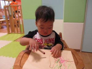 保育者が手を添えながら、点だけでなく線も描けるように「かきかきだよ。」と、声掛けをすると、だんだんと描く要領がわかってきたようで、楽しんでいました![]()