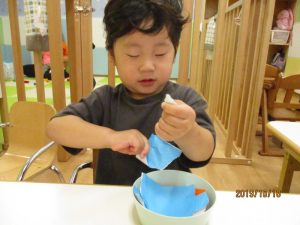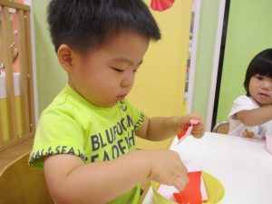 新聞紙あそびの時と違い、折り紙を破るのは少し難しいようでしたが、がんばっていましたよ![]()