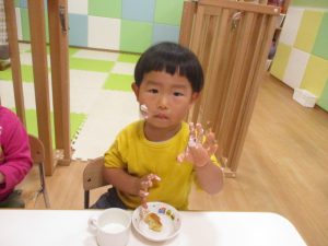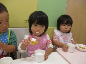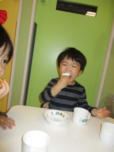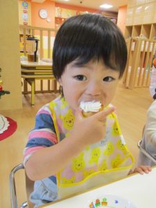 口いっぱいにクリームをつけて、とてもおいしそうに食べていました?![]()