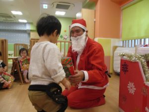 親子クリスマス会にもサンタさんが来ましたが、クリスマスの日にもサンタさんがプレゼントを持って、会いに来てくれました