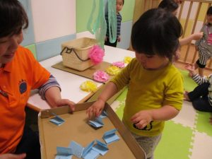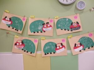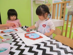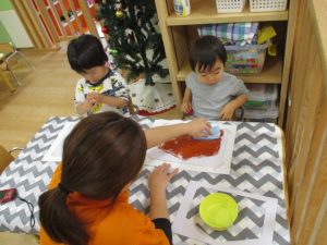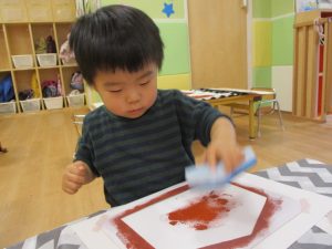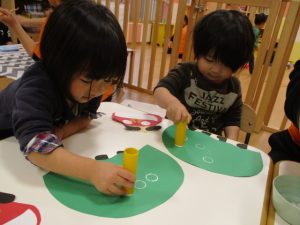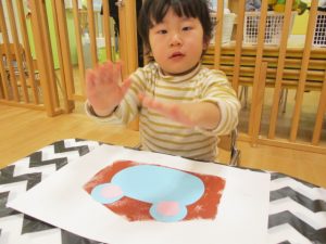 「え~これ、粘土のやつやん。」と、言いながらも、絵の具を付けて、画用紙に模様をつけていくと、きれいな丸が付いて大喜び![]()