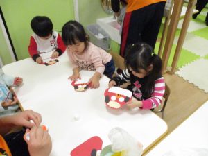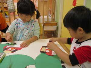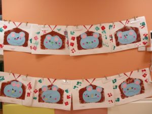 次に絵馬の中にねずみを貼り、目や鼻、ほっぺ、耳を自分で色を選んで、貼っていきましたよ![]()