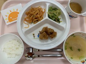 ご飯 味噌汁 鶏のから揚げ スパゲティー野菜ソテー おかか和え