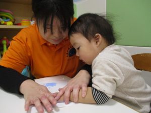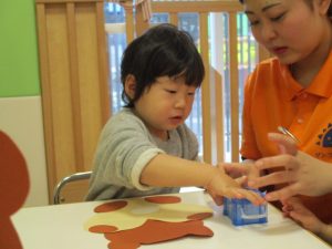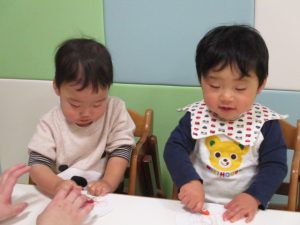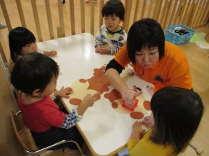 手形を取ることにすっかりと慣れてきて、「おててをパーにしてね。」と言うと、しっかりと手を広げてくれましたよ![]()