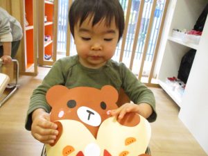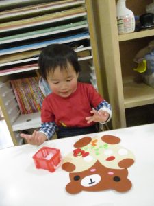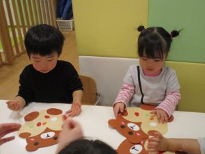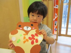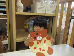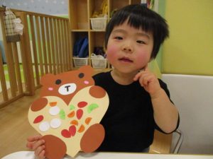 ひとつひとつ貼るときに「これは目?、これは口?!!」と言いながら貼り、どこに貼るのか考えながら、取り組んでいましたよ![]()