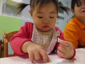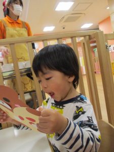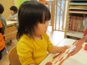 今までは、シールを台紙から、はがすことが出来ず、1枚、1枚渡していましたが、今回は自分で台紙からはがそうとする姿が見られ、上手にめくるお子さんもいましたよ![]()