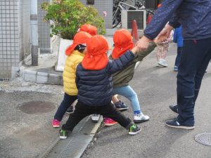 車が来たら、端に寄りますよ~(保育者がいつも足を広げて、守っているせいか、子どもたちも足を広げてしまいます![]()